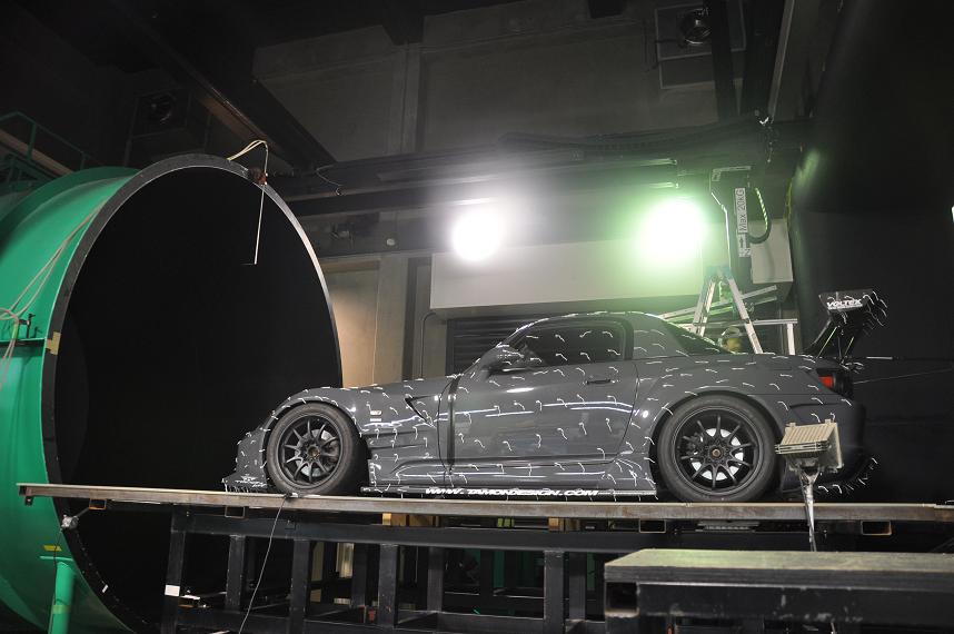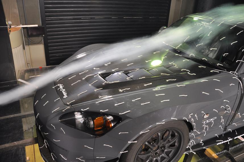 風を実車に当てて空気の抵抗・流れ・発生するダウンフォースを計測します。